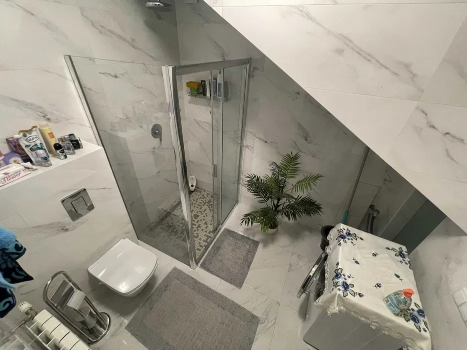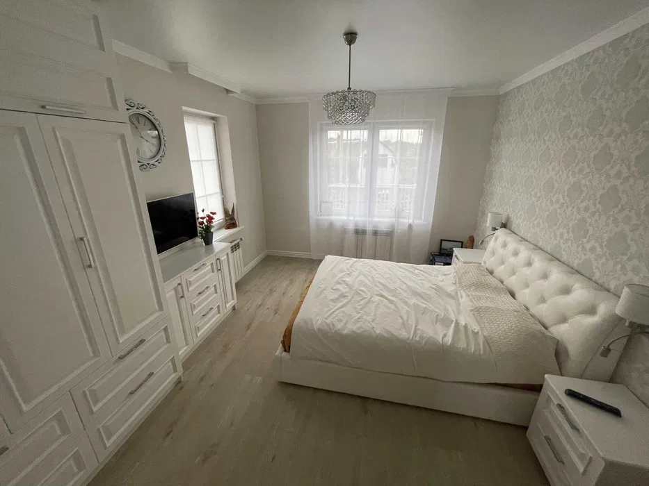 Фундамент выполнен из бута, стены - из газоблока + базальтовая вата + штукатурка барашек, крыша - битумная. Столярка выполнена вся на заказ, материал - ясень. Мебель в спальне из дерева. Кухня выполнялась на заказ (фасады крашены, столешница - мрамор). Окна - Salamandra bluEvolution 92 curve. Балкон - кованный. Лестница - дуб.