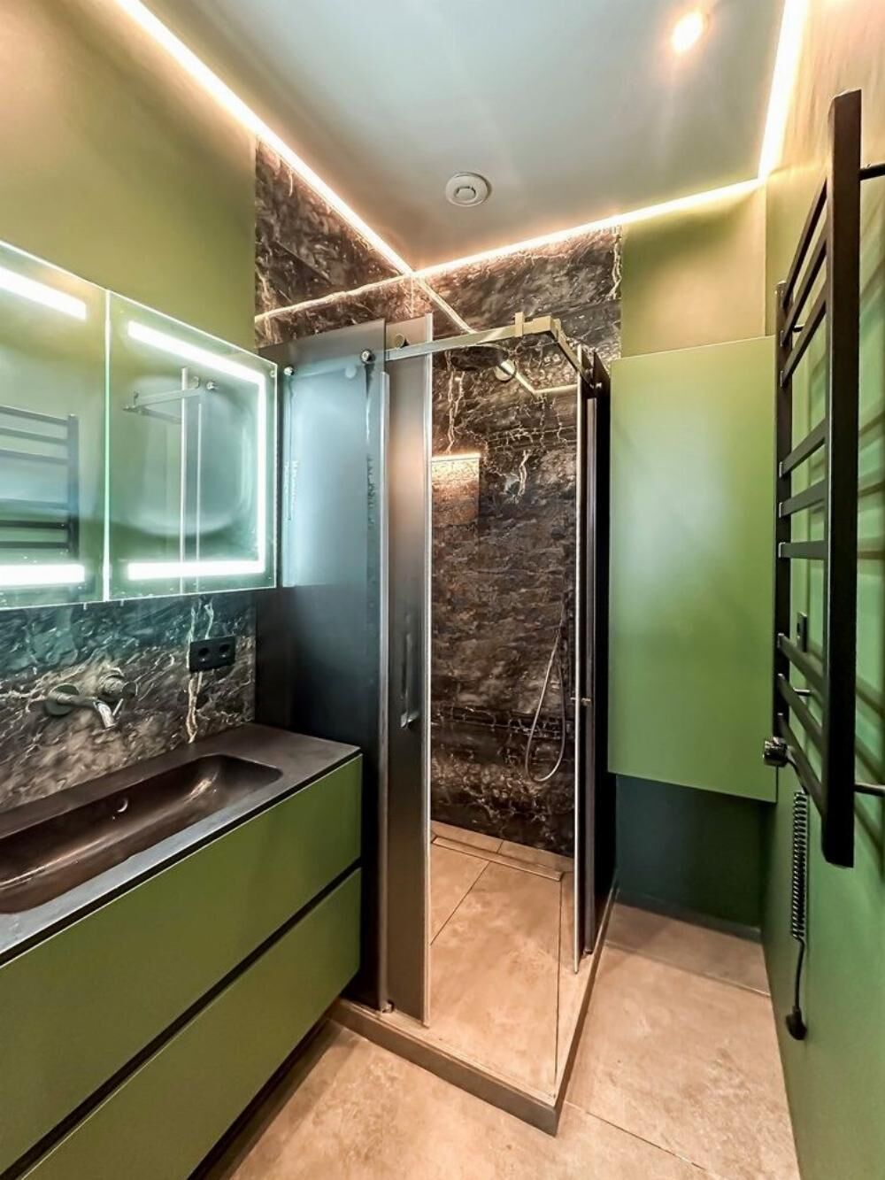 У квартирі новий дизайнерський ремонт. Меблі виконані з якісного фарбованого МДФ, ліжко облаштовано ортопедичним матрацом з системою зима/літо, встановлені двері прихованого монтажу на магнітах під колір стін, дизайнерські люстри, мармурові підвіконня, підлога виконана з вінілу міцного класу і має зоновану систему. У кухні вбудована техніка, стільниця та фартух виконані з натурального каменю, змішувач 3 в 1.