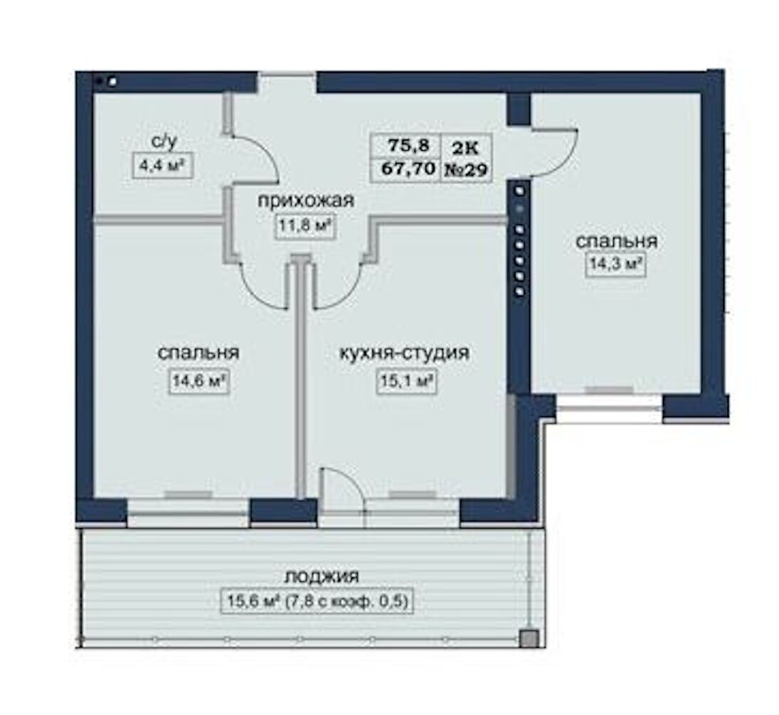 Формат квартири: кухня-вітальня, спальня, майстер-спальня, санвузол, ванна кімната, лоджія.