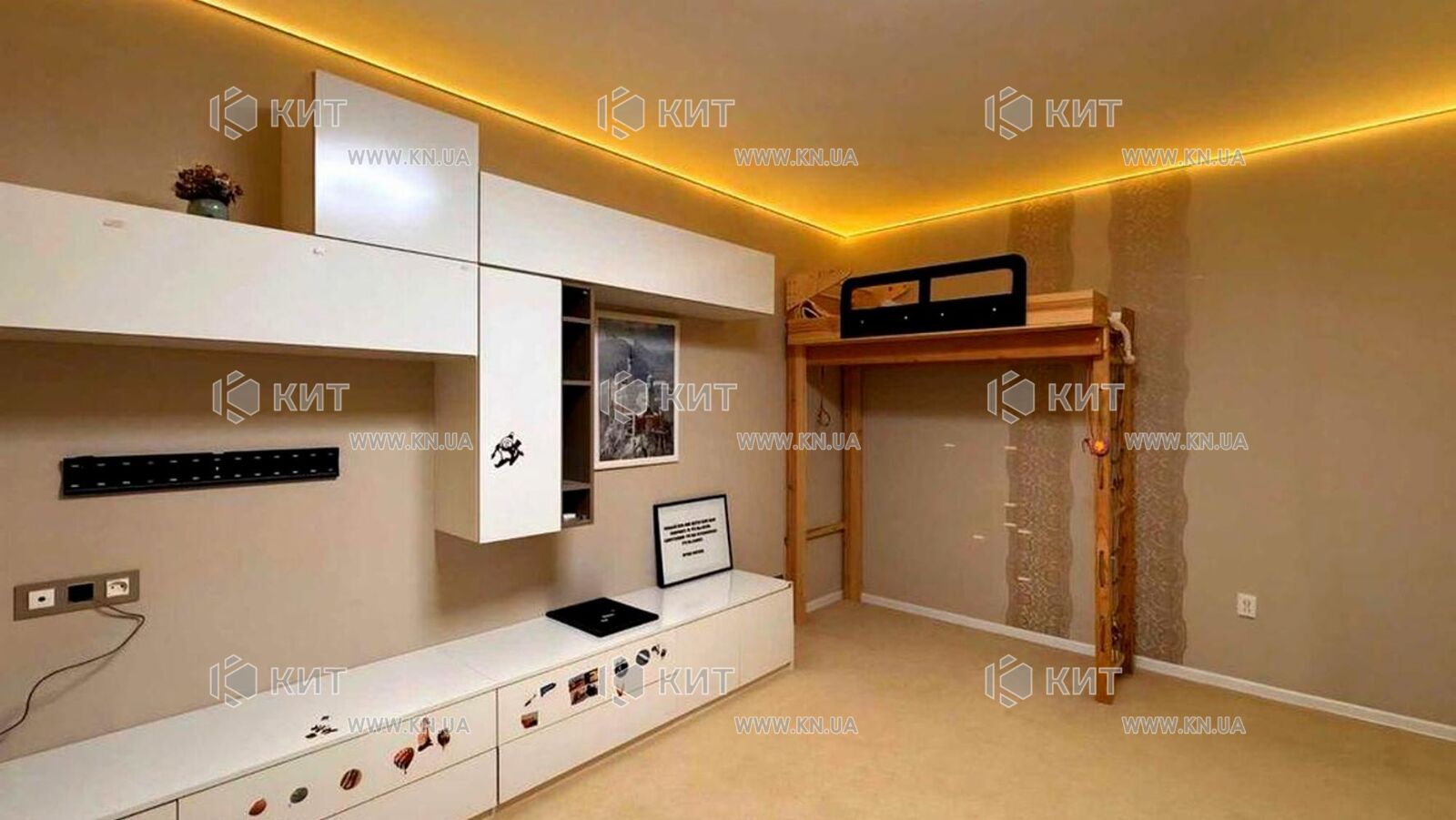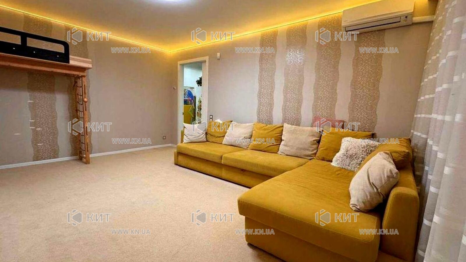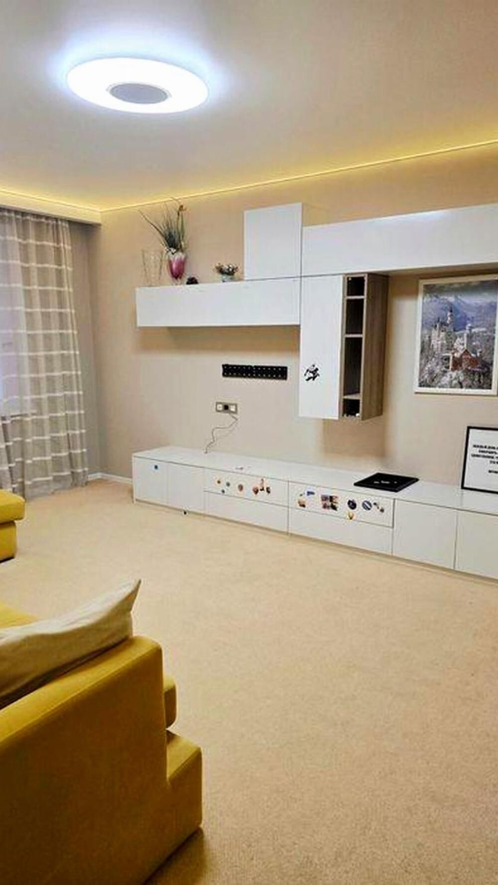 Вітальня: великий італійський диван (≈3×2 м), вбудовані меблі виконані на індивідуальне замовлення з якісних матеріалів, декоративне підсвічування, передбачені висновки під телевізор. Встановлено японський кондиціонер Daikin – дуже тихий та економічний.