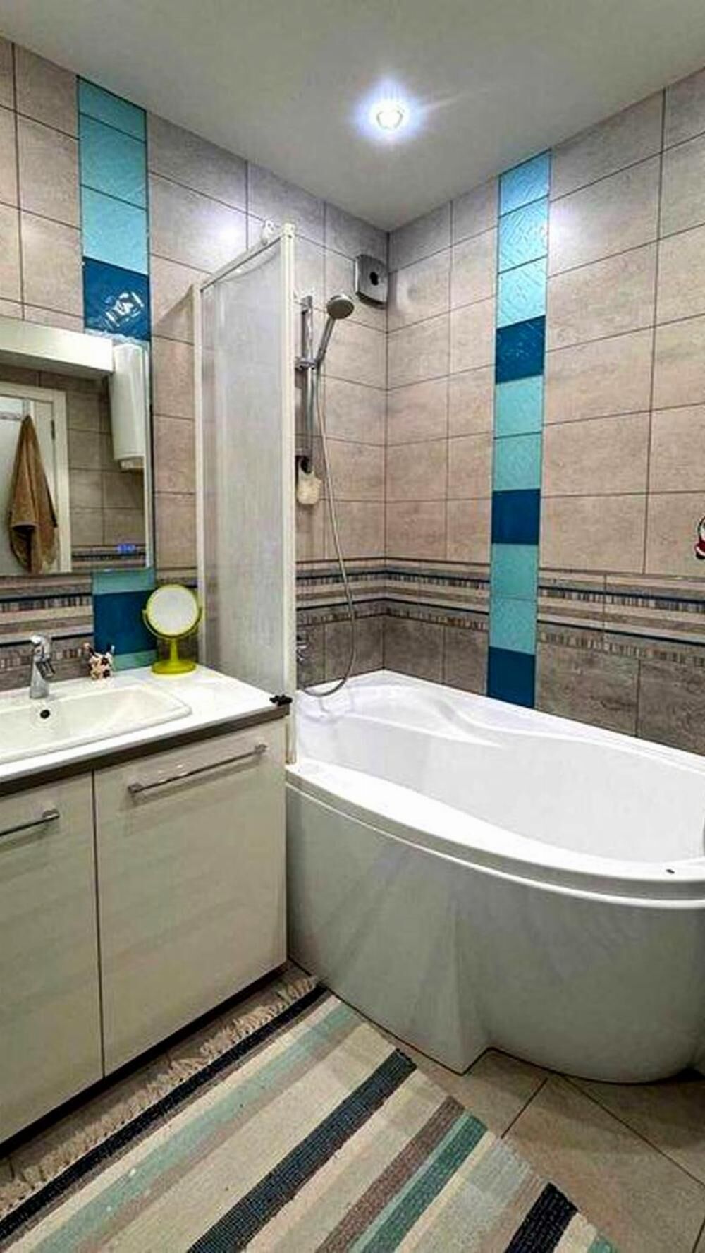 Просторий суміщений санвузол: ванна RAVAK, сантехніка KOLO, змішувачі Hansgrohe, душова система Hansgrohe, вбудовані меблі.